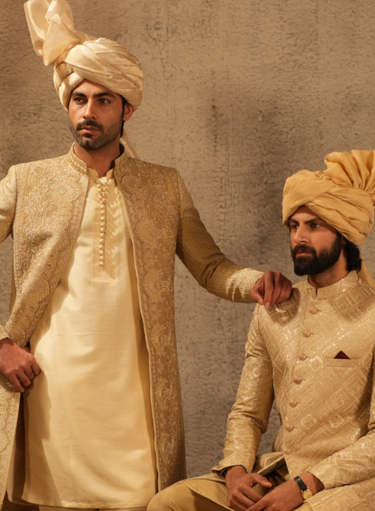 A classic ivory sherwani adorned with intricate gold patterning across a rich textured base.Regal, refined, and timeless — a graceful statement of tradition elevated with contemporary elegance. Color: Ivory (Royal Gold)Fabric: Raw Silk EmbroideredWork Details: Sequence Embellished On Embroidered Fabric- Rs.34,800.00