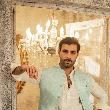 A striking prince coat crafted in a rich emerald-teal textured fabric, detailed with intricate all-over woven motifs and subtle sequin accents that add depth and refined brilliance. Designed with a sharp mandarin collar, heritage gold buttons, and a structured, tailored silhouette, this piece delivers...- Rs.19,800.00