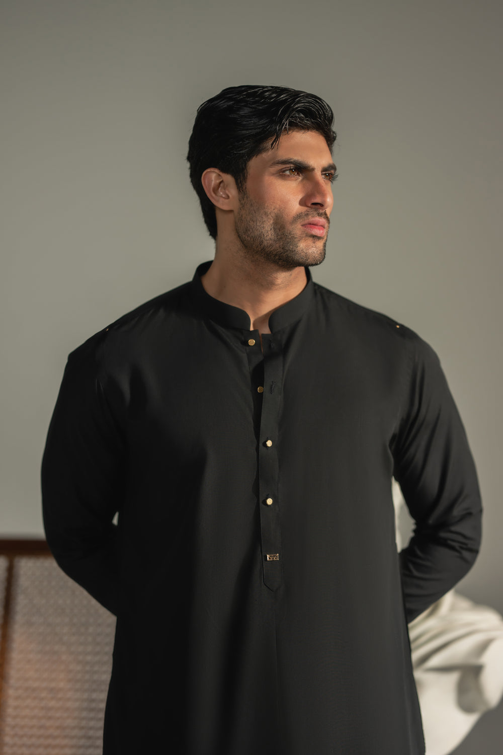 The structured band collar and minimal placket are elevated with subtle metallic button accents, adding just the right touch of distinction. The clean, uninterrupted silhouette enhances its commanding presence, while the premium fabric drapes smoothly for effortless comfort.