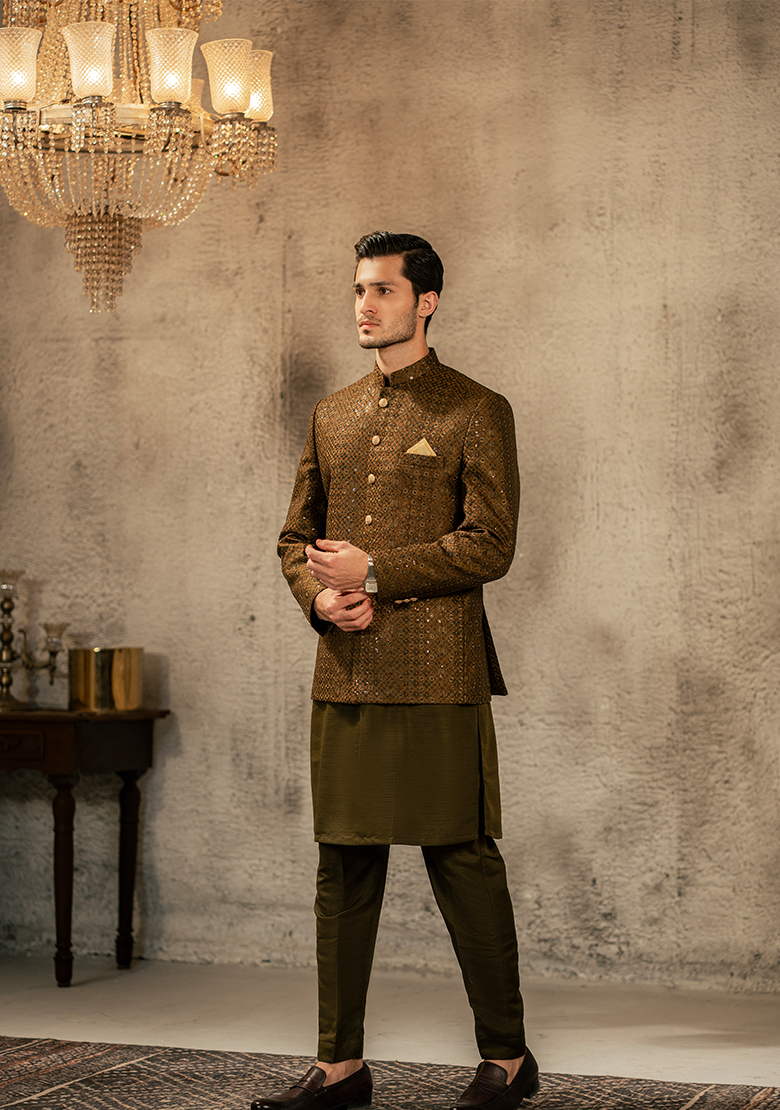 A statement prince coat crafted in a deep olive-brown textured fabric, featuring intricate all-over woven motifs with subtle sequin detailing for a refined shimmer.