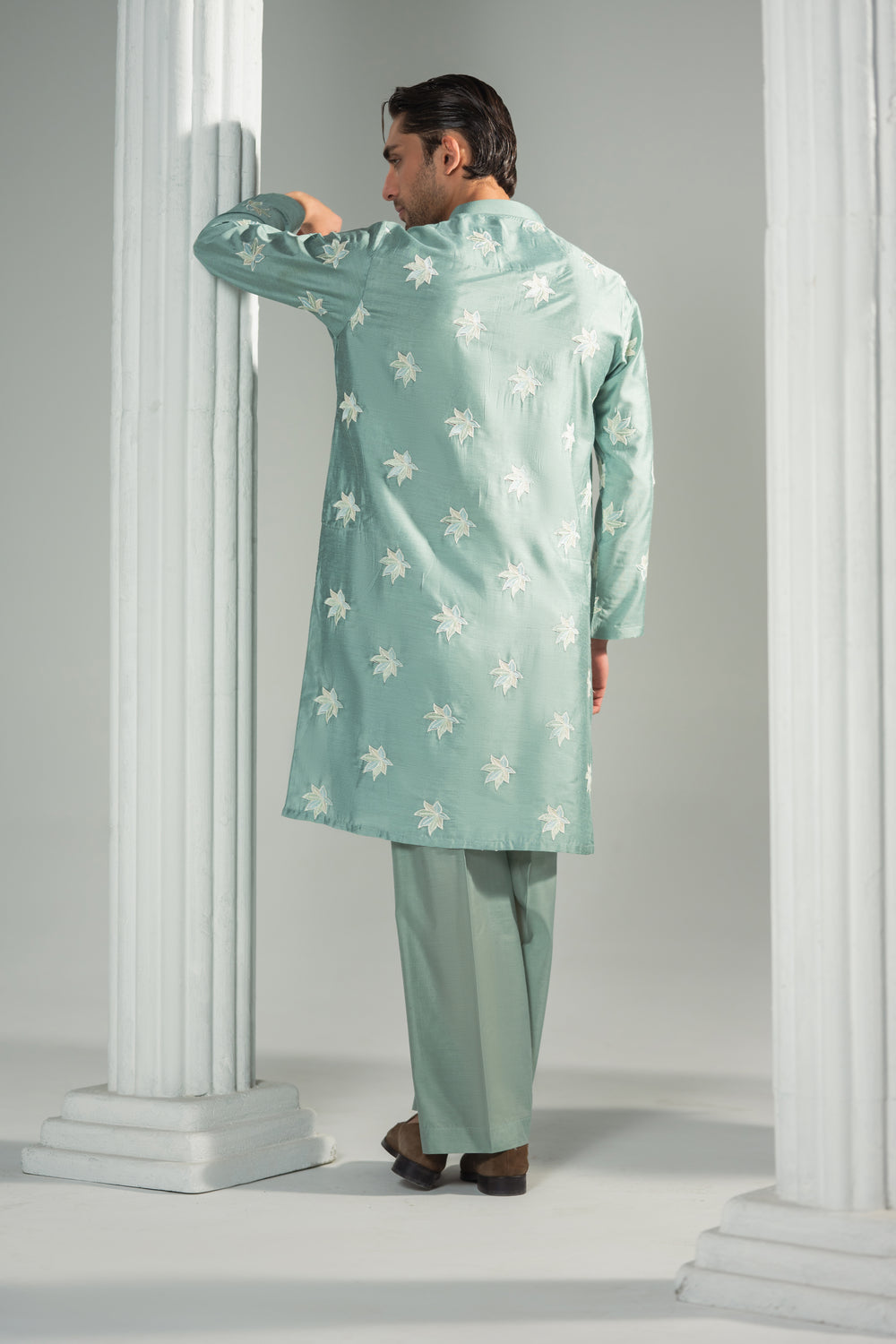 Designed with a clean band collar and a structured front placket, the silhouette remains sharp and modern while honoring traditional tailoring. Paired with a coordinated straight shalwar, this ensemble offers a seamless, polished look perfect for Eid mornings, family gatherings, and celebratory evenings.