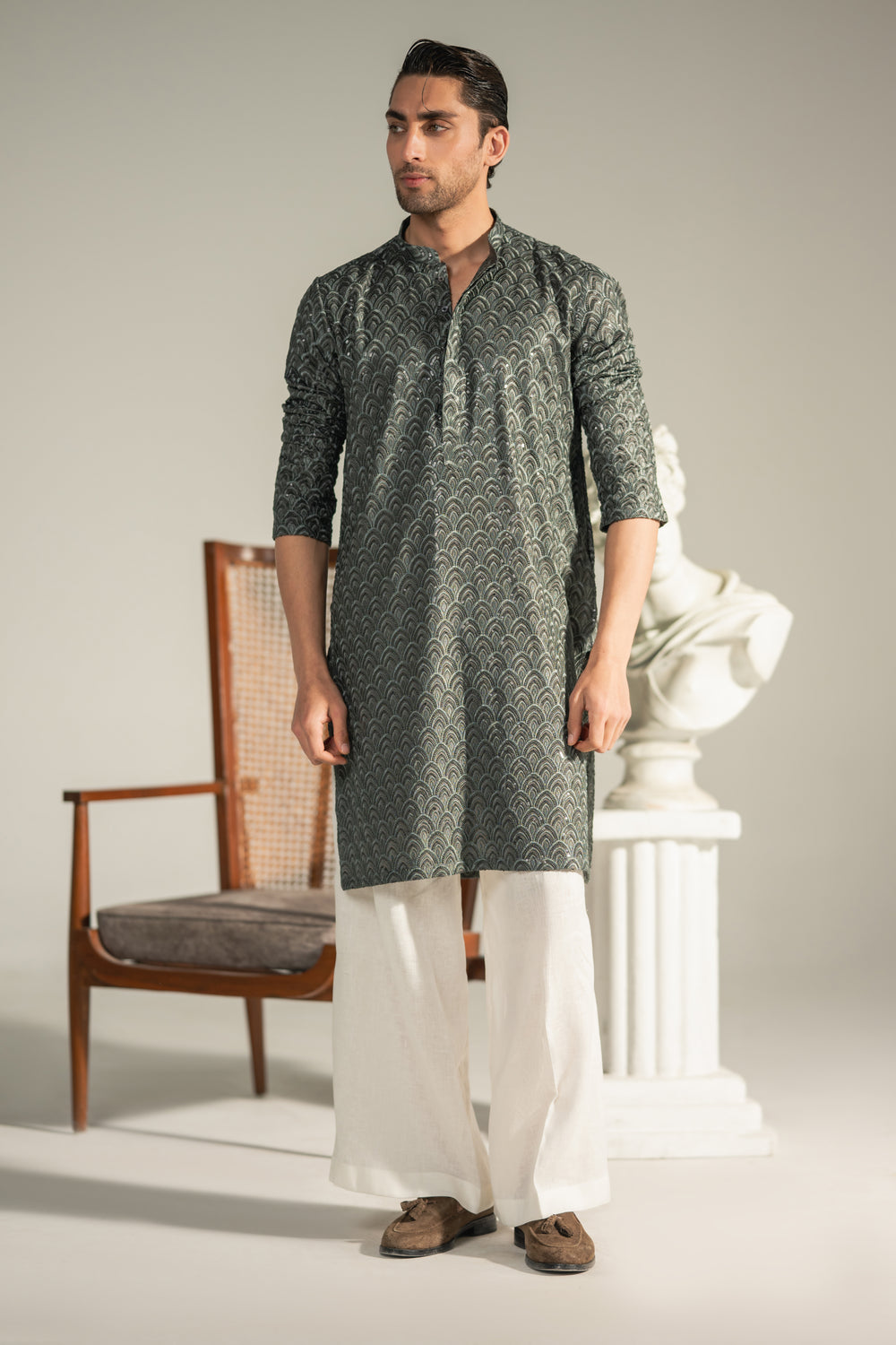 The structured band collar and tailored cut enhance the sharp silhouette, while the fluid fall of the fabric ensures comfort and ease. Paired with an ivory shalwar, the contrast balances the depth of the embroidered kurta, creating a look that is both modern and rooted in tradition.
