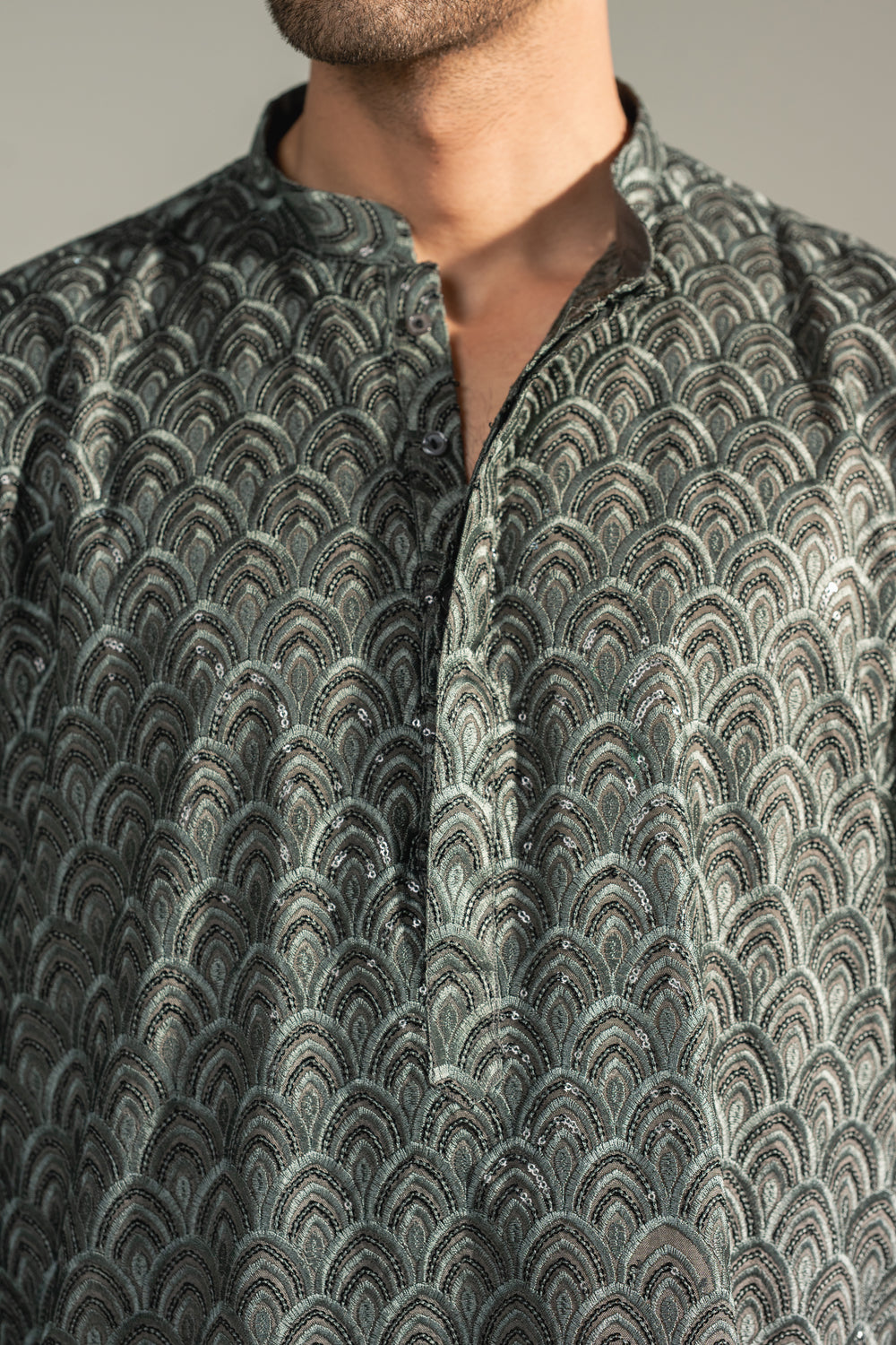 Understated yet striking, the Haider Obsidian Arc is crafted in a deep charcoal-toned base enriched with intricate arc-pattern embroidery throughout. The repeating textured motif creates a subtle rhythm across the fabric, offering dimension and quiet luxury.