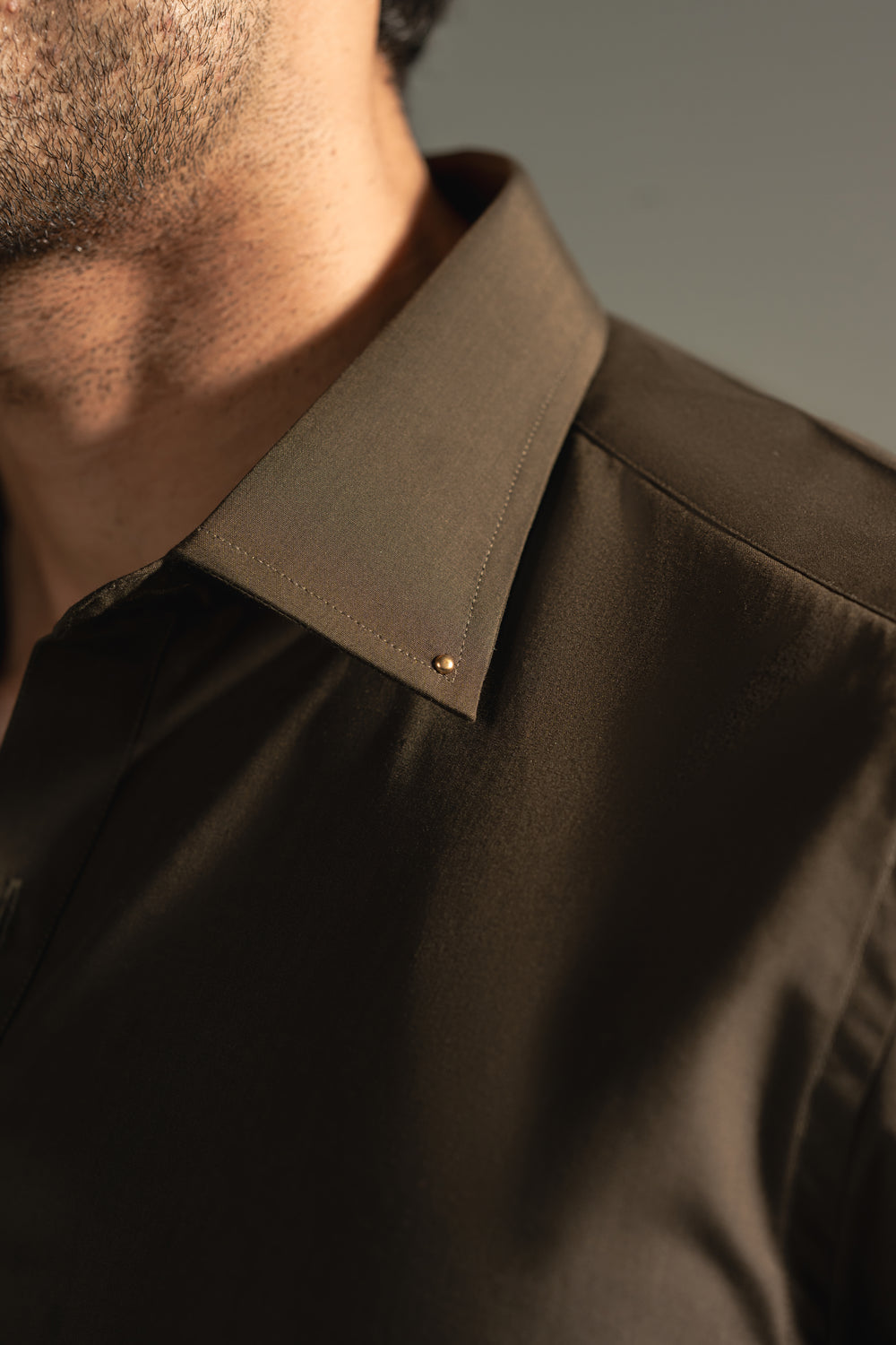 Designed with a structured collar and accented placket featuring subtle metallic buttons, the silhouette remains sharp while preserving effortless comfort. The clean, uninterrupted surface highlights the richness of the fabric and the precision of tailoring, allowing the tone itself to make the statement.