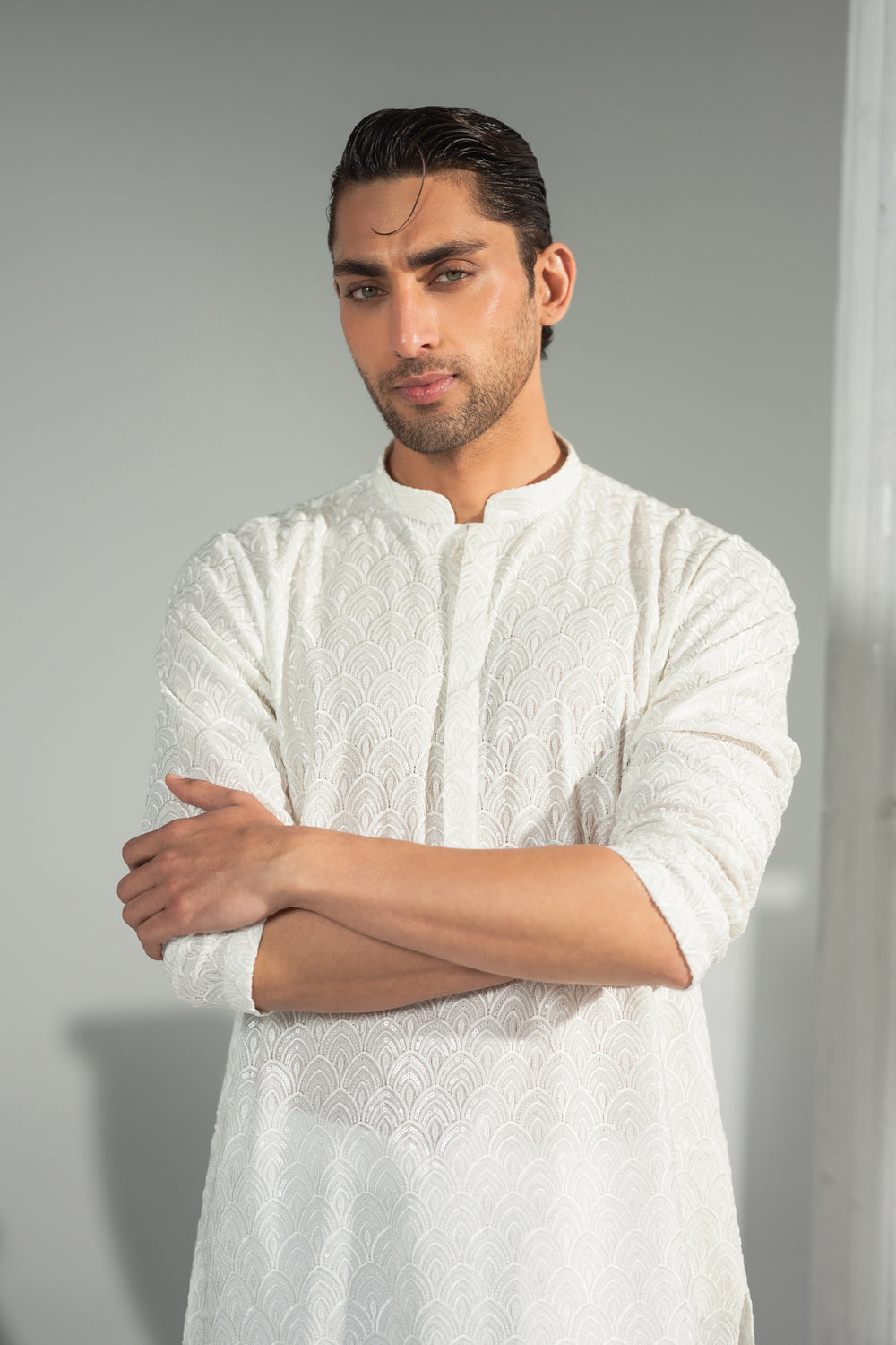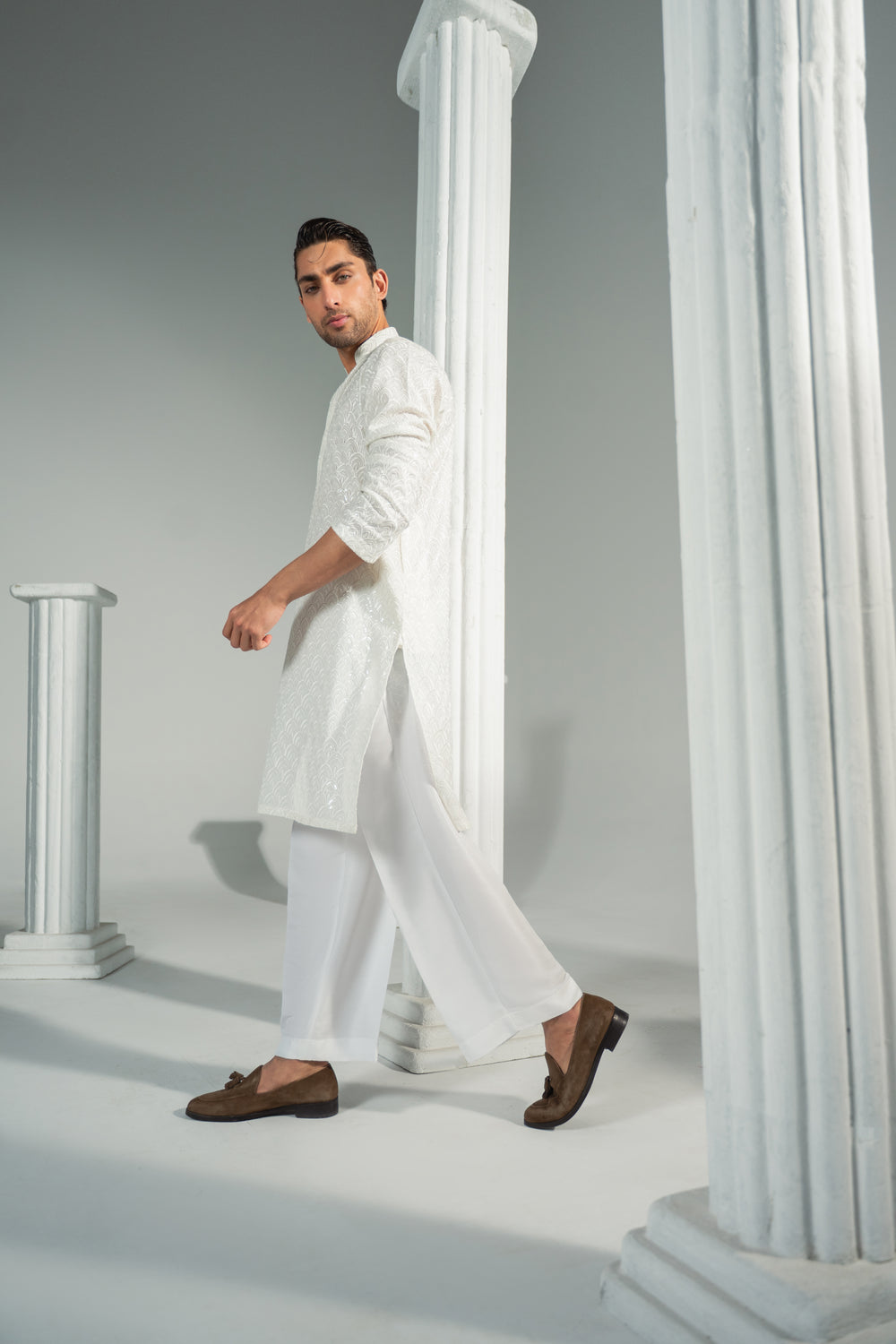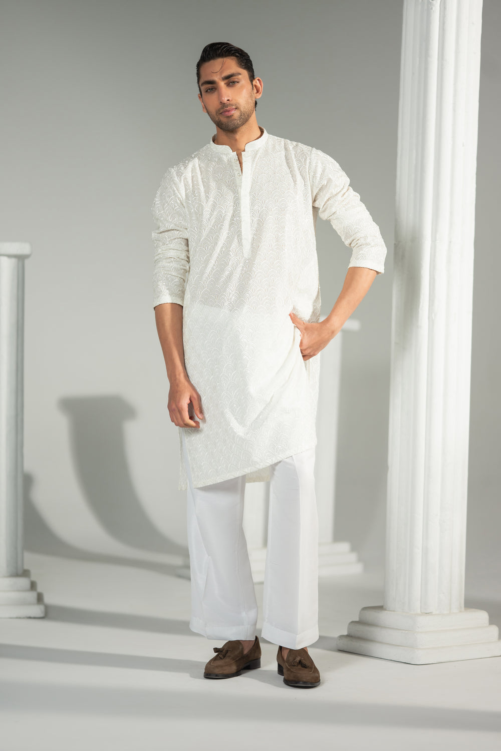 Designed with a refined band collar and a structured placket, the silhouette remains sharp yet effortless. Paired with classic straight white trousers, Safa delivers understated sophistication — perfect for the modern gentleman who values simplicity, grace, and timeless style.