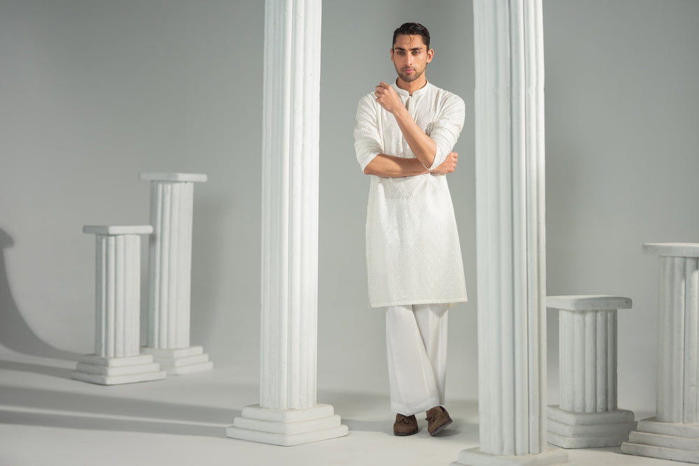 An embodiment of purity and quiet elegance, the Safa Kurta Set is crafted in a soft ivory tone, elevated with subtle self-textured embroidery that flows seamlessly across the fabric. The intricate tonal pattern adds depth and refinement while preserving a clean, minimal aesthetic ideal for Ramadan gatherings and Eid mornings.