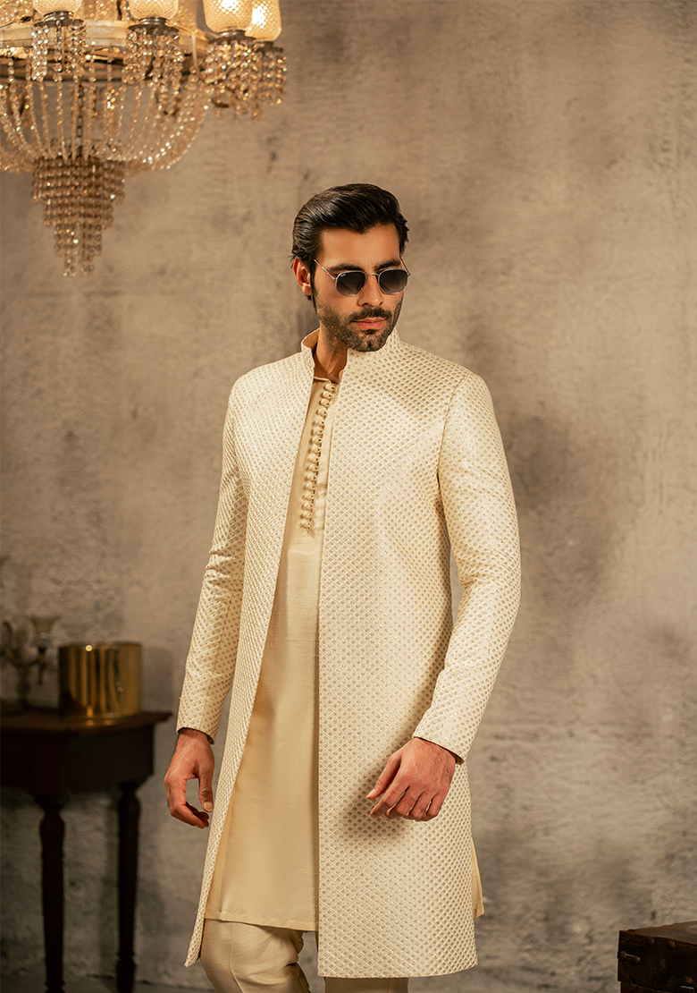 A refined off-white sherwani crafted in a delicately patterned fabric, paired with a soft-toned kurta for a balanced, elegant look.