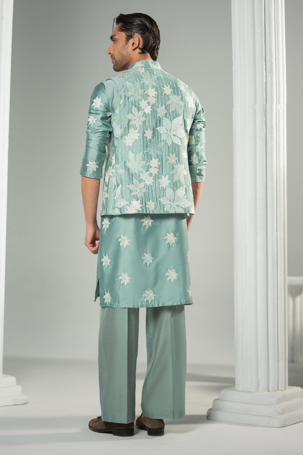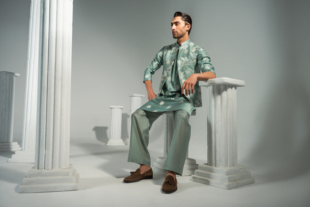 Rich in tone and regal in presence, the Zyran Verdant Dominion Waistcoat is crafted in a refined sage green base adorned with intricate ivory botanical embroidery. The flowing leaf motifs create depth and movement, delivering a festive yet controlled elegance. Structured with a sharp mandarin collar and polished metallic buttons, this piece is designed for the Kingsman who commands attention through refined artistry rather than excess.
